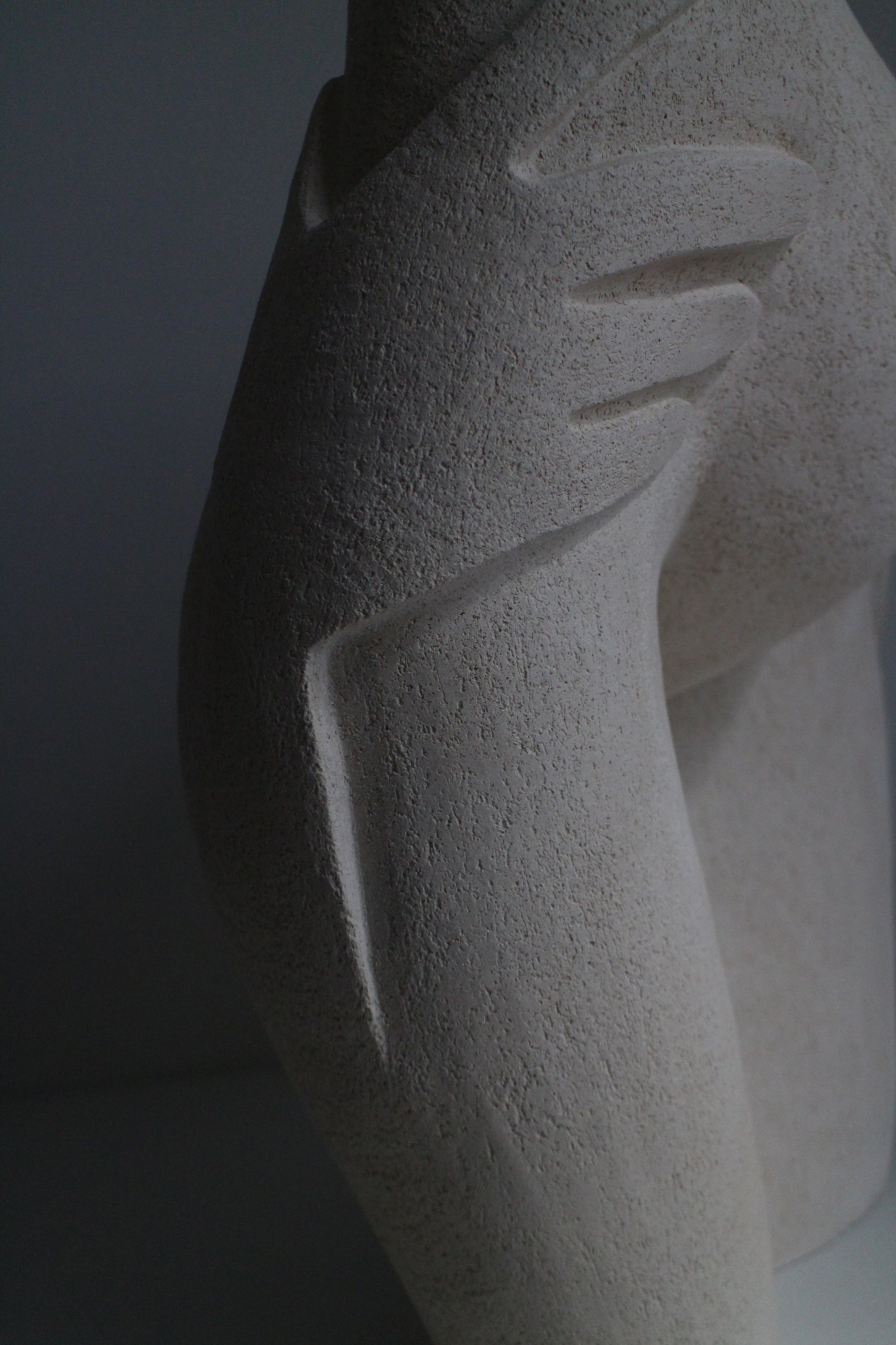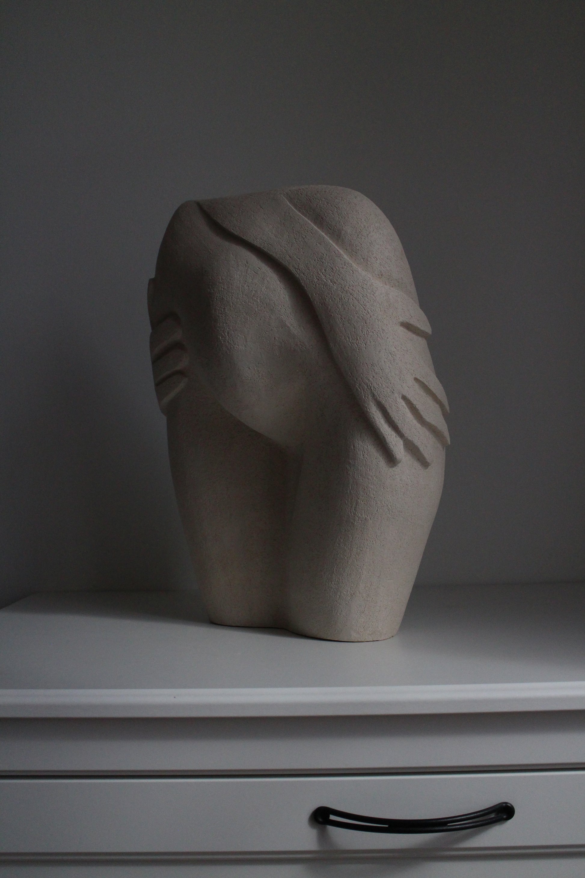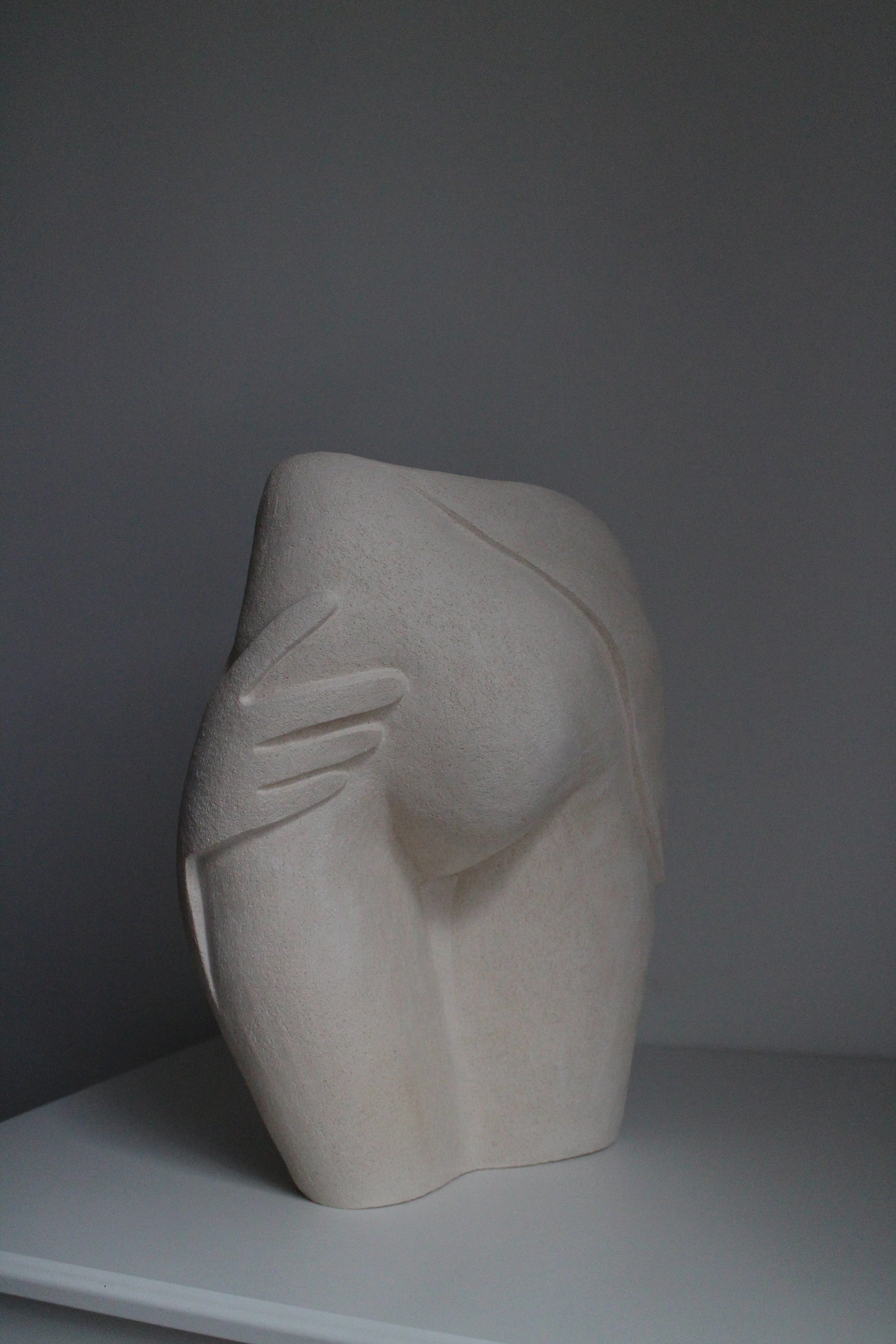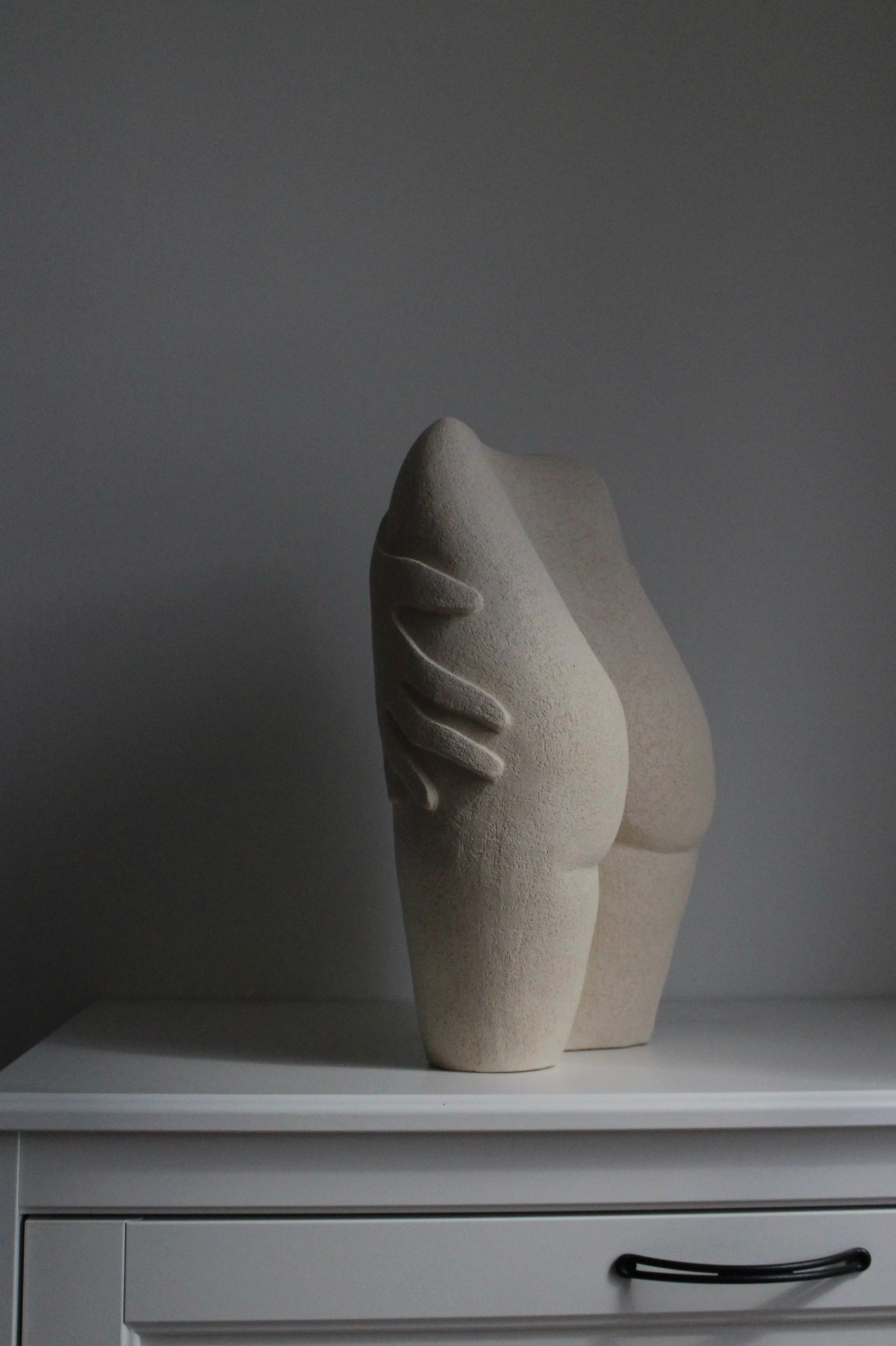Bassin au ventre arrondi et deux mains sculptées sur les hanches .